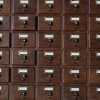 Description: A wall of warm, wooden card catalog shelves with brass handles.
